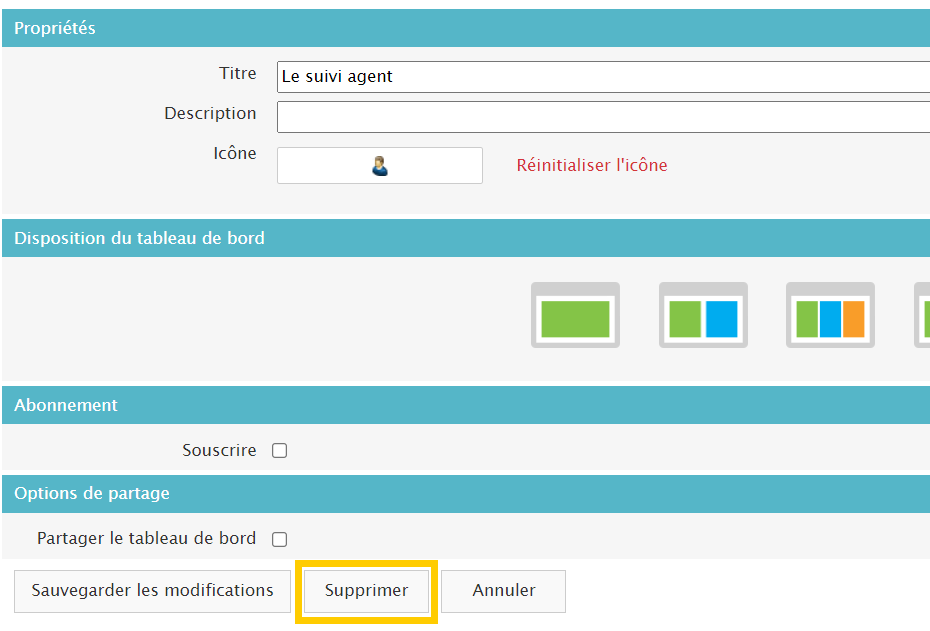 Cliquez sur le petit icone de votre tableau de bord et les paramètres de ce tableau de bord vont s’ouvrir :