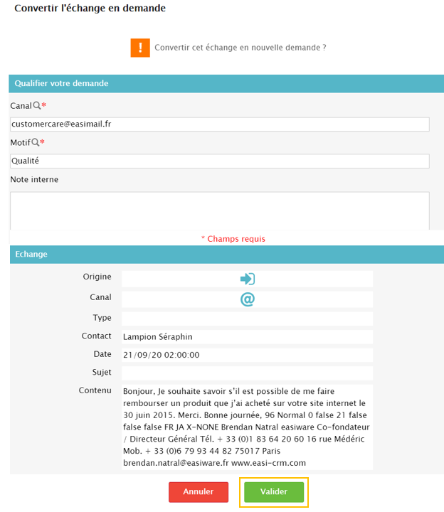Quand le client vous pose une nouvelle question sur une ancienne demande datant de plusieurs semaines, l’ancienne demande est réouverte. Mais le motif n’a rien à voir avec l’ancienne demande. Dans ce cas, vous pouvez « convertir ce nouvel échange en nouvelle demande ». Cela permet de ne pas fausser les statistiques et de traiter une nouvelle demande sans anciens échanges.