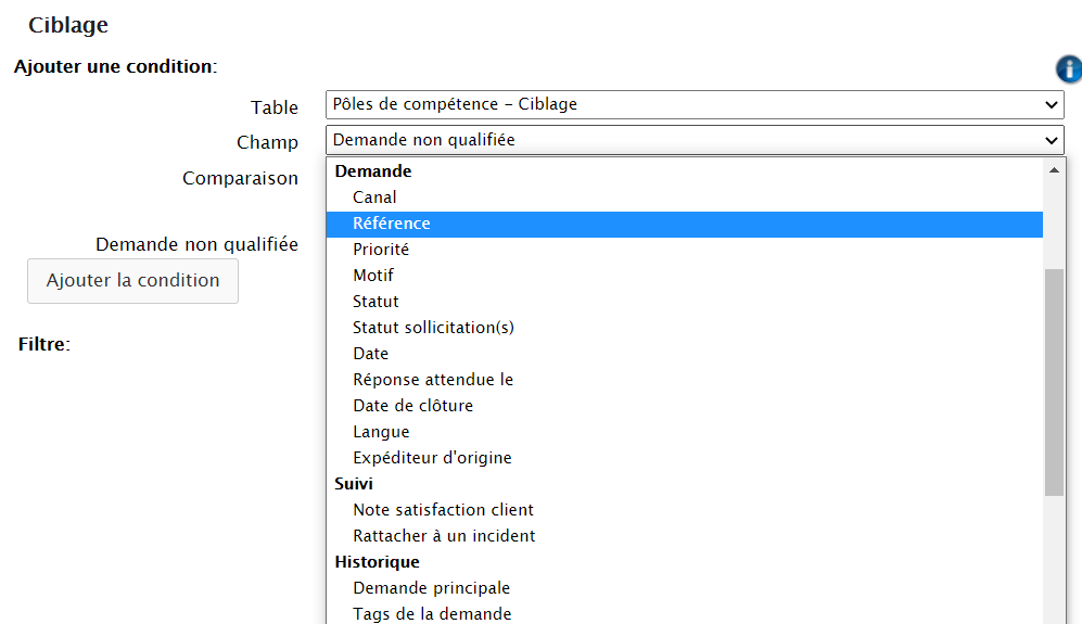 Le ciblage des demandes qui vont être affectées automatiquement au pôle de compétence que vous êtes entrain de créer peut se faire sur plusieurs critères comme le canal de la demande, le motif de la demande, la priorité de la demande, l’entité…..