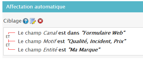 Exemple : Dans ce pôle de compétence seront affectées automatiquement les demandes de l’entité “ma marque” avec la canal “formulaire web” et les motifs “qualité, Incident et prix”.
