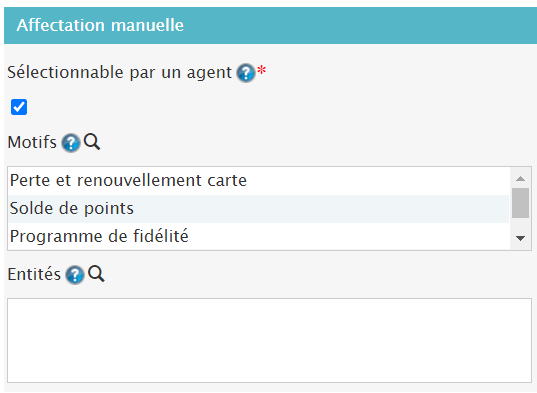 Exemple : Dans ce pôle de compétence, les agents pourront affecter manuellement des demandes avec les motifs “perte et renouvellement de carte”, “solde de points” et “programme de fidélité” quelque soit l’entité de provenance de la demande