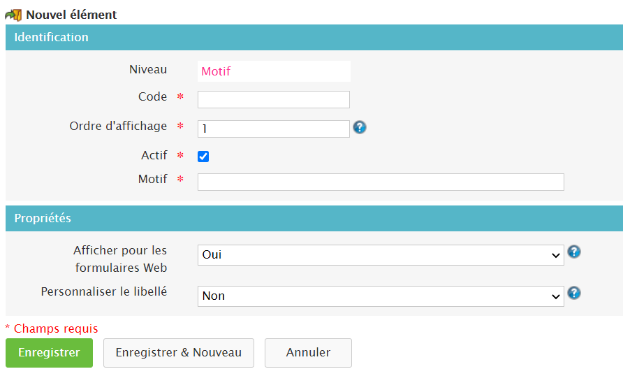 Dans la partie Motif, écrivez le libellé (le nom) du motif qui sera visible dans la liste déroulante sur la demande du client.