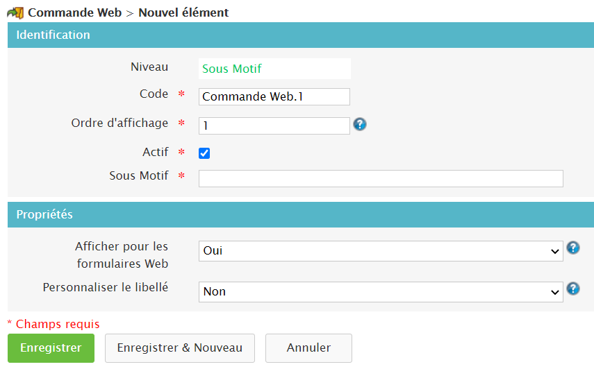 Si vous mettez oui dans “afficher dans les formulaire web”, le champs motif apparaitra dans les champs pouvant être mis dans le formulaire sur le site web pour que le client qualifie sa demande.