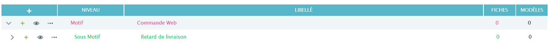 Vous voyez ci-dessous le motif (rose) et le sous-motif (vert)qui sont créés. Vous pouvez créer autant de motifs et de sous-motifs que vous voulez. Faites néanmoins attention de ne pas en créer de trop, car l’agent aura beaucoup plus de mal et prendra plus de temps à qualifier la demande si la liste des motifs et sous-motifs est longue.