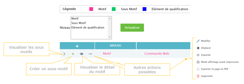 La création de motifs et de sous motifs vous permettra de qualifier vos demandes clients par thématique. La pertinence des motifs vous donnera une bonne vision de votre service client dans les reporting. Nous vous conseillons au maximum une arborescence à 2 niveaux