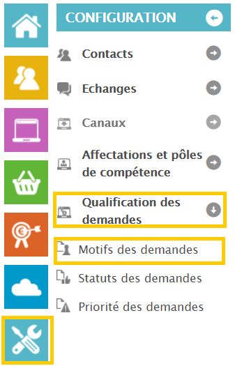 Cliquez sur “configuration”, “qualification des demandes ” et “Motifs de demandes”: