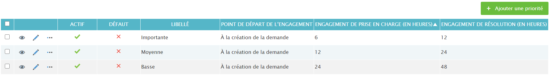 Vous avez ci-dessous les 3 priorités créées par défaut, et vous avez la possibilité d’en créer d’autres en cliquant sur le bouton “ ajouter une priorité”.