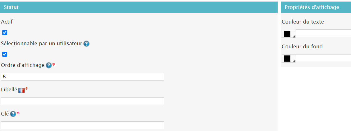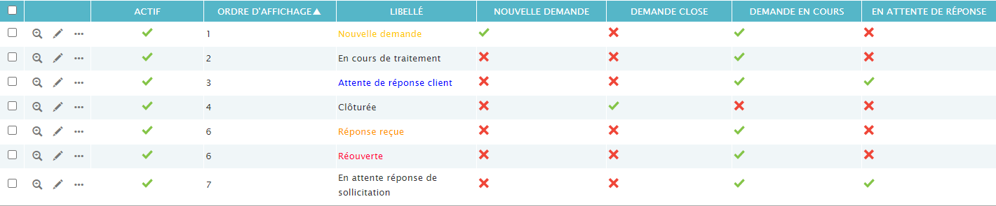 Le numéro de l’ordre d’affichage permet de classer les statuts dans la liste déroulante des statuts sur la demande client.