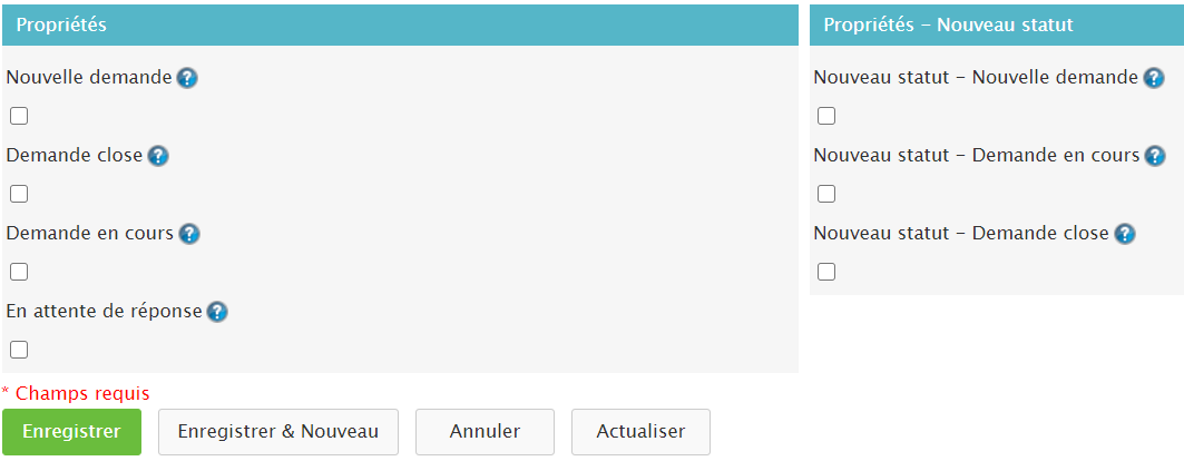Dans la partie “propriétés”, cochez la case correspondante au statut que vous créé : Si le statut créé correspond à une nouvelle demande, à une demande close, à une demande en cours ou à une demande en attente de réponse.