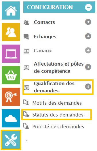 Cliquez sur “configuration”, “qualification des demandes” et “statuts des demandes”: