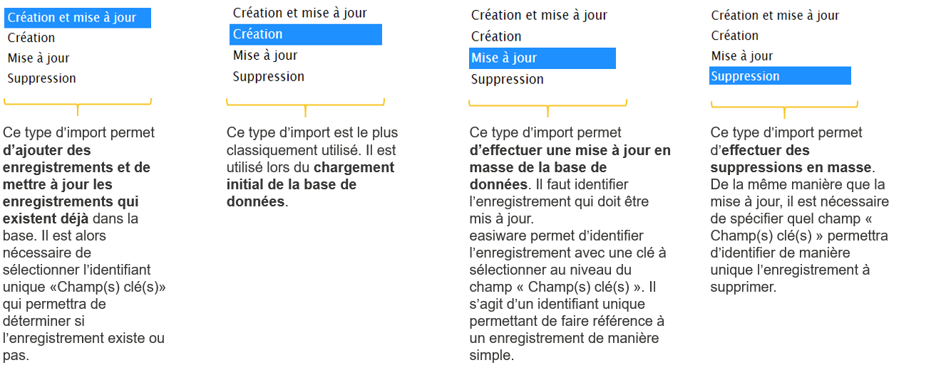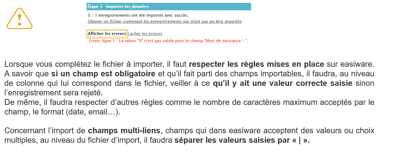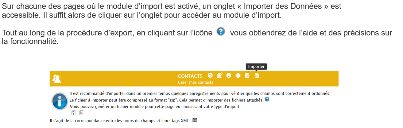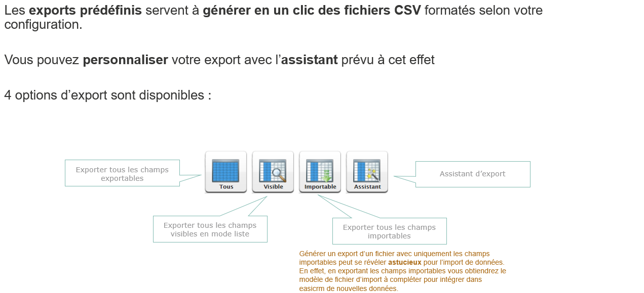 L’import et l’export de données est une fonctionnalité activée sur l’ensemble des pages de easiware. Cette fonctionnalité est disponible en fonction des droits utilisateur. Pas défaut, seuls les utilisateurs ayant le profil « administrateur » peuvent y accéder.