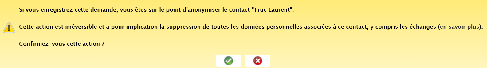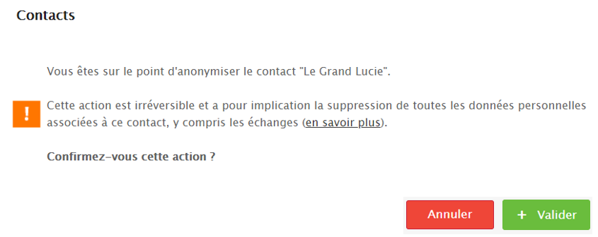 Ce message d’alerte apparait et pour valider l’anonymisation du contact, cliquez sur “valider” (en vert) :