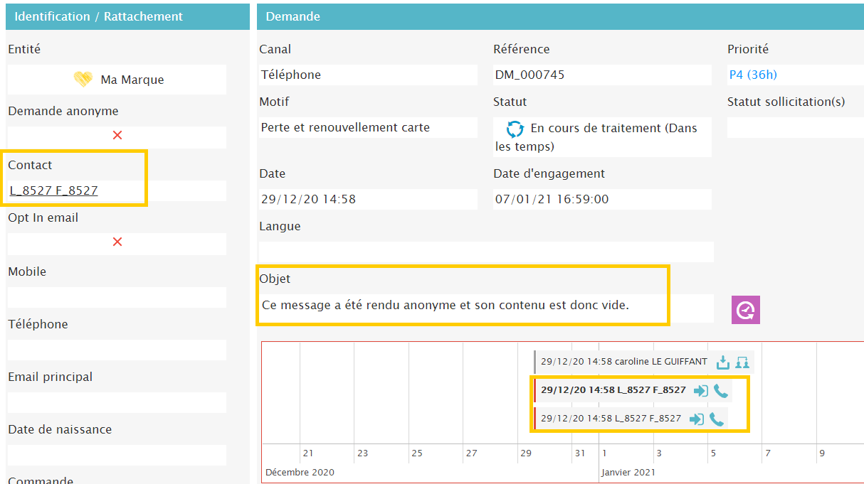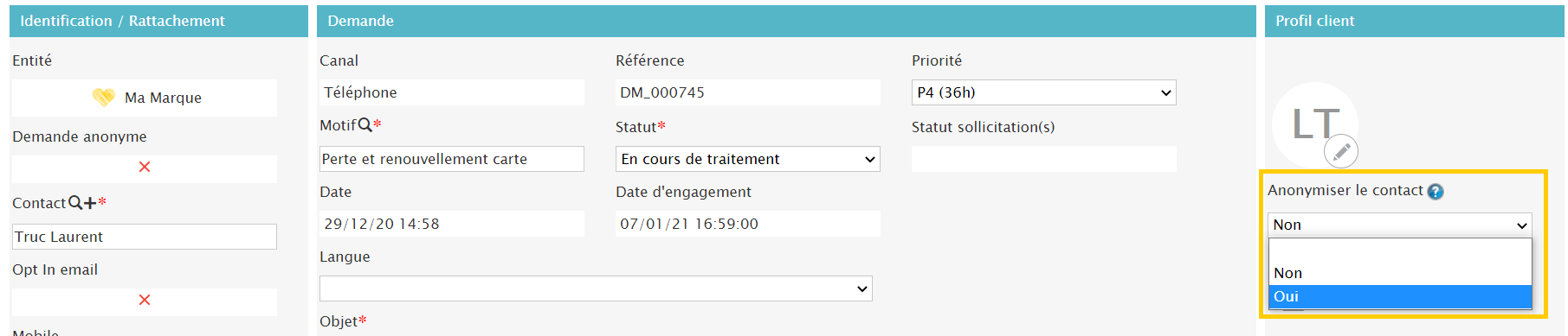 Une fois le contact anonymisé la demande et le contact se présentent comme cela :