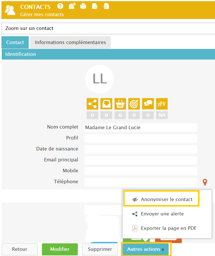 Cliquez sur “autres actions” et “Anonymiser le contact”