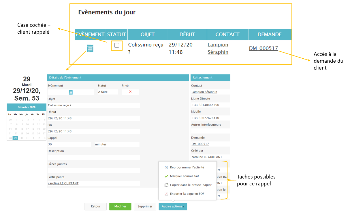 Lors du traitement d’une demande client, vous pouvez avoir besoin de rappeler le client. easiware vous permet de mettre un rappel dans votre calendrier afin de ne pas oublier de rappeler le client. Vous améliorez l’expérience de votre client.
