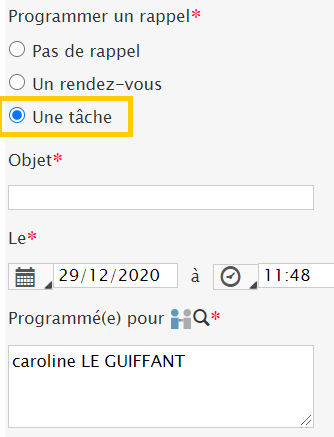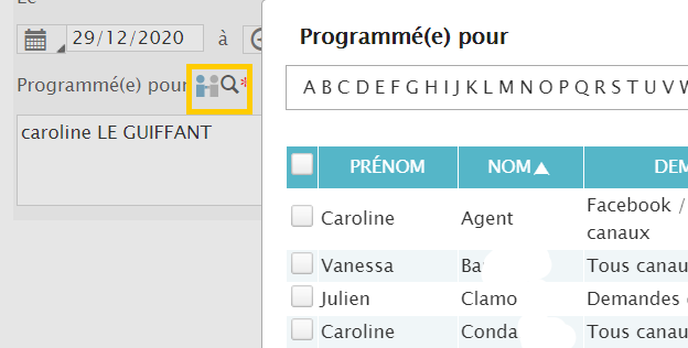 Par défaut le rappel vous est attribué. Il est possible d’attribuer ce rappel à une personne ou à plusieurs personnes en cliquant sur la “loupe” et en sélectionnant les personnes :