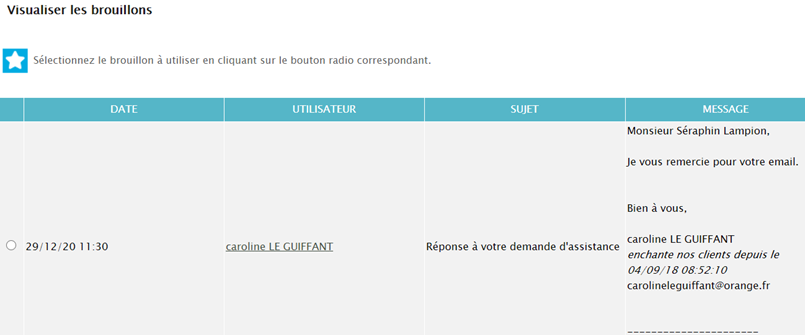 Il suffit de cliquer sur le fichier afin de choisir votre brouillon , de le modifier si nécessaire et d’envoyer l’email au client.