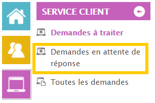 La demande du client n’apparaitra plus dans la file des demandes à traiter mais dans le menu “service client” et “Demandes en attente de réponse”. La demande reviendra dans la file des demandes à traiter automatiquement lorsque il y aura la réponse de la personne sollicitée et la demande sera en statut “réponse reçue”.