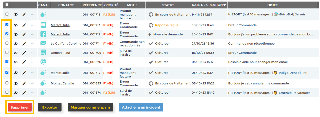 Suppression des demandes & des pièces jointes
