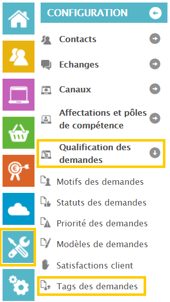 Cliquez sur “configuration”, “qualification des demandes” et “tags des demandes”: