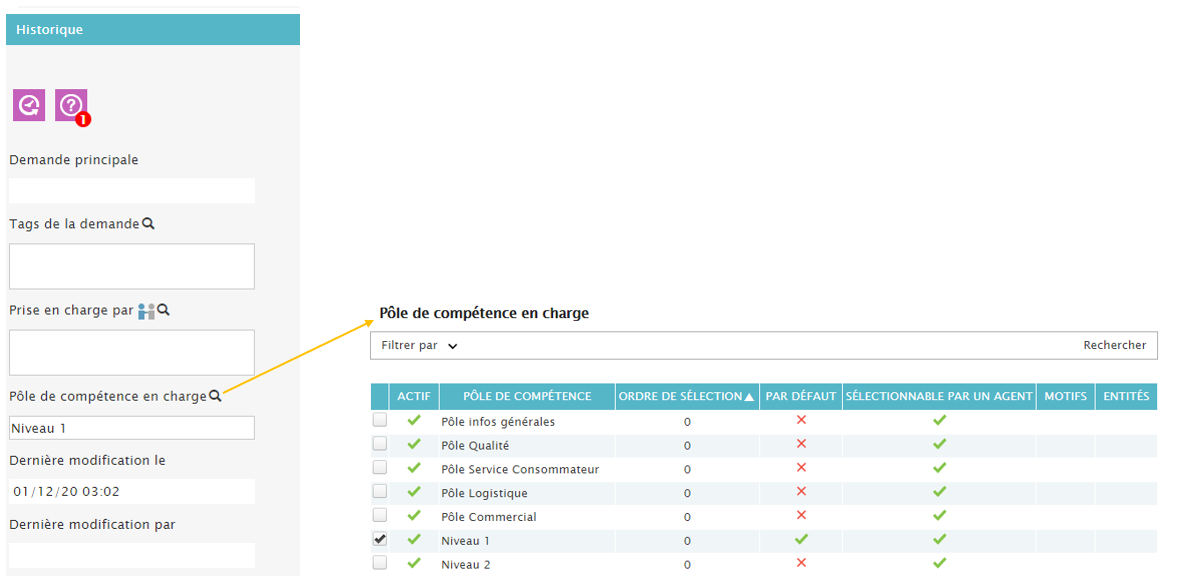 Par défaut, dans l’exemple ci dessous, la demande est dans le pôle de compétence “niveau 1”. Pour transférer cette demande au Pôle “Qualité” , vous allez cliquer sur la case à gauche du pôle dans lequel vous souhaitez transférer la demande.